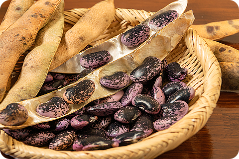 花豆は、涼しくて標高の高い地域でしか栽培できません。うす焼きには、大粒で鮮やかな紫色の“紫花豆”の甘煮がごろごろ入ってます。